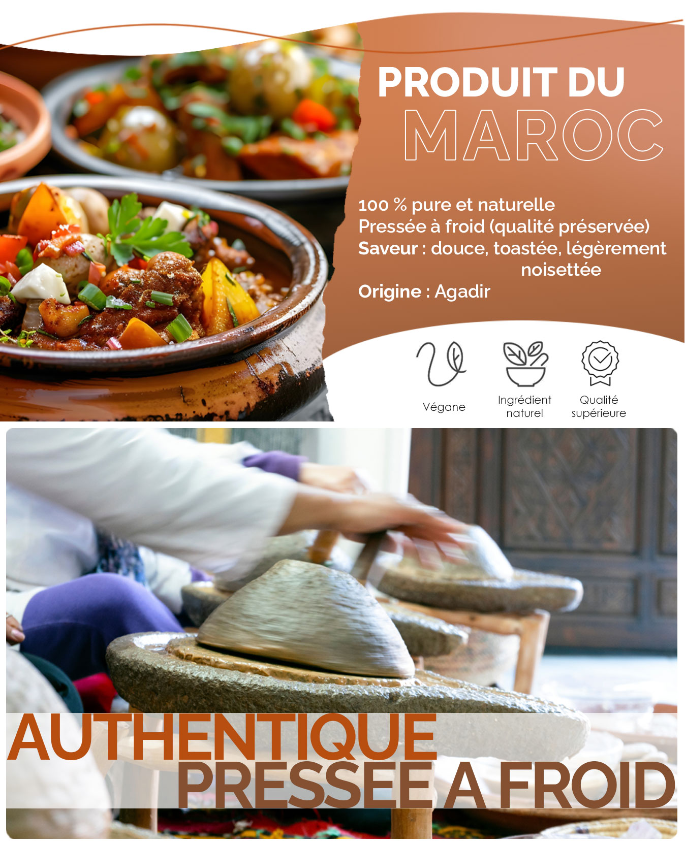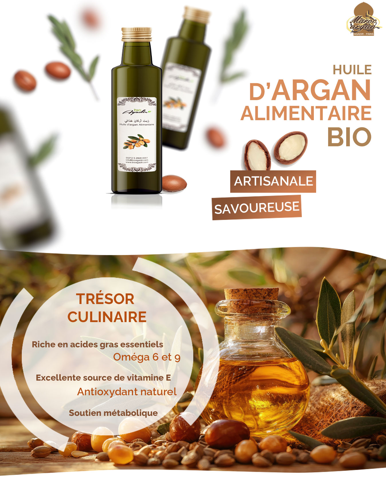Avec un léger goût de noisette, l’huile d’Argan est très appréciée en cuisine apportant une odeur agréable à votre cuisine. À utiliser comme l’huile d’olive par exemple, sa saveur confèrera une touche orientale à vos plats.