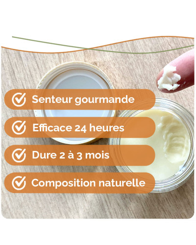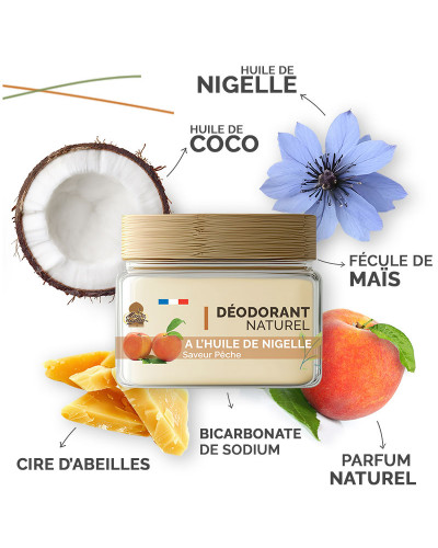 Composants: Huile de coco, cire d'abeilles, fécule de maïs, bicarbonate de sodium, huile de Nigelle, parfum naturel