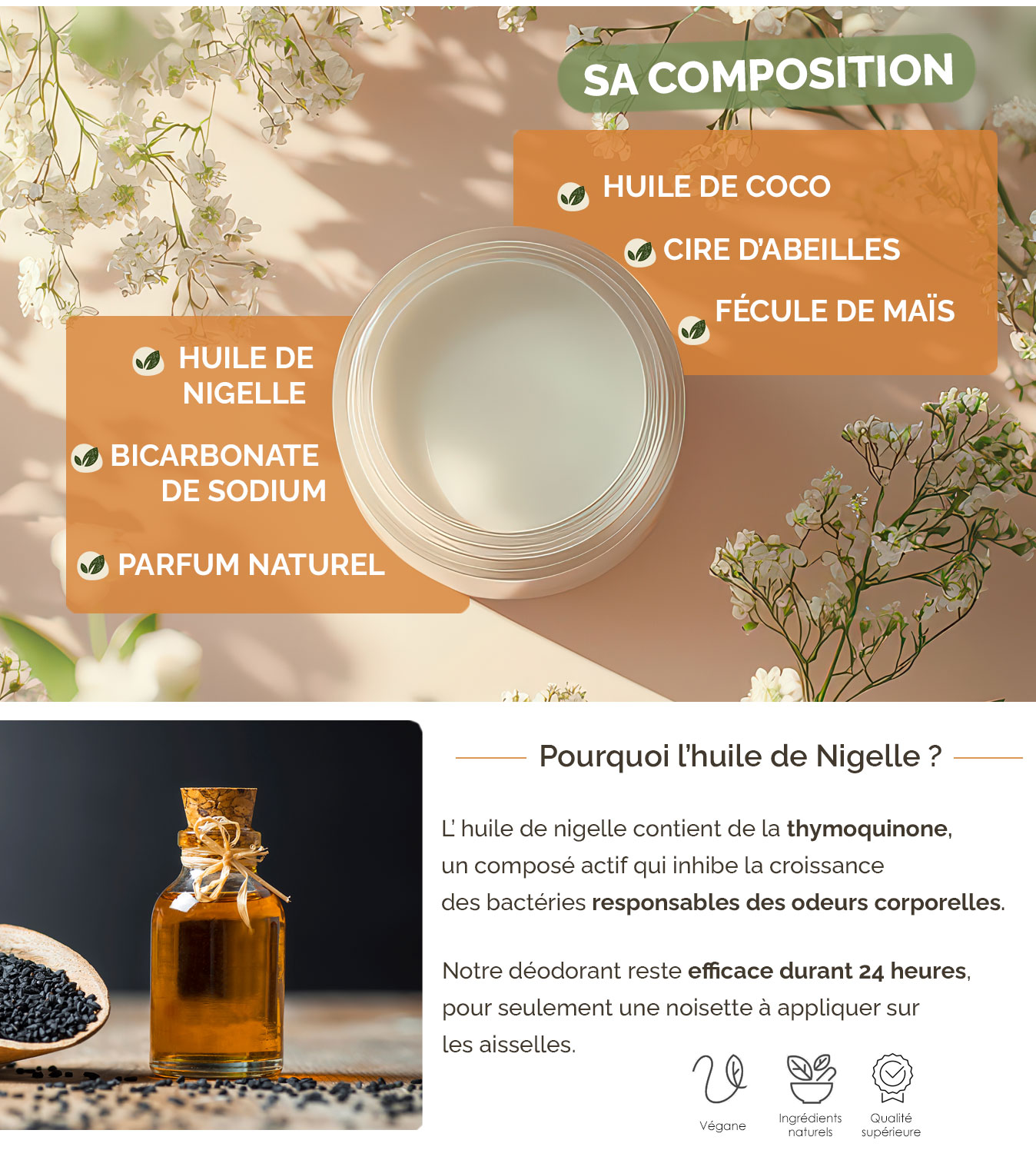 ✨FORMULE 100% NATURELLE : Composée uniquement d’ingrédients simples et efficaces : huile de coco, cire d’abeille, bicarbonate de sodium, fécule de maïs et huile de nigelle (Nigella sativa).